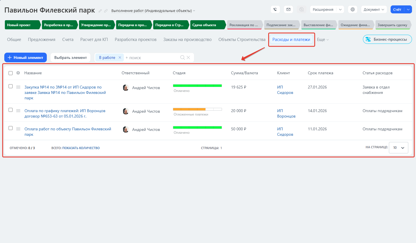 Когда платеж обрабатывается в Финансовом отделе, будь то запрос платежа из заказа клиента или по запросу из другого отдела, например, производственного, связанного с выполнением заказа, информация о платеже автоматически фиксируется в карточке сделки или заказа клиента.