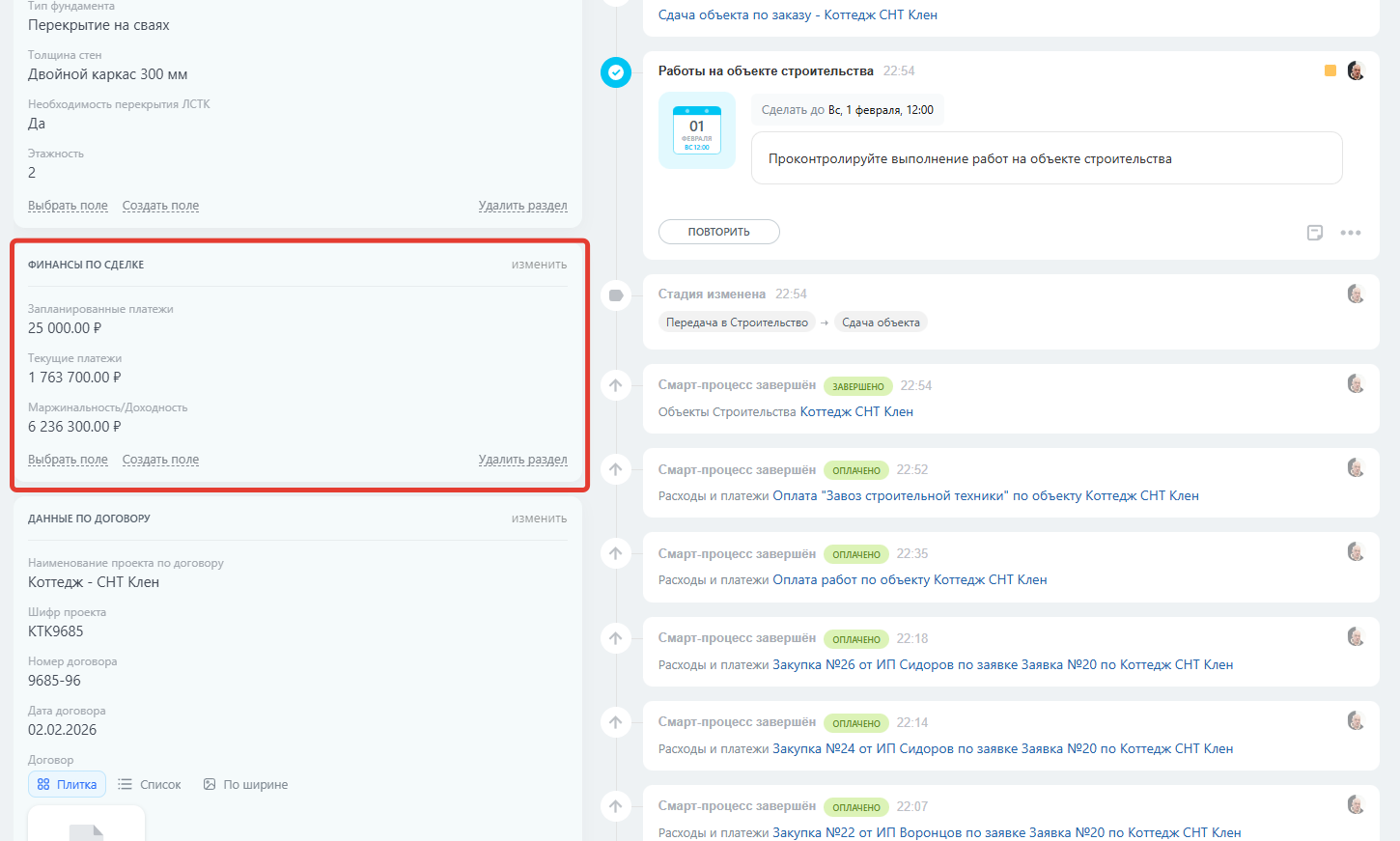 После внесения данных система автоматически вычисляет общую сумму платежей по сделке и отображает её в финансовом разделе карточки. При этом учитываются как запланированные платежи (которые согласованы, но ещё не произведены), так и текущие оплаты, с расчётом доходности сделки.