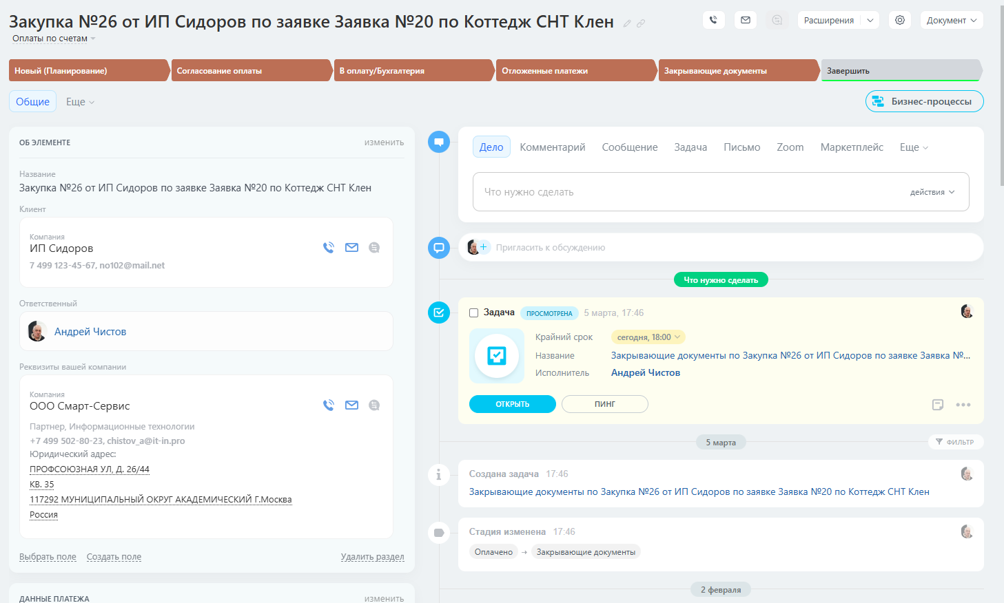 Бизнес-процесс оплаты также предусматривает возможность запроса от инициатора на предоставление закрывающих документов. После оплаты платеж переходит в стадию «Закрывающие документы», и инициатору ставится задача предоставить необходимые документы для закрытия счета.