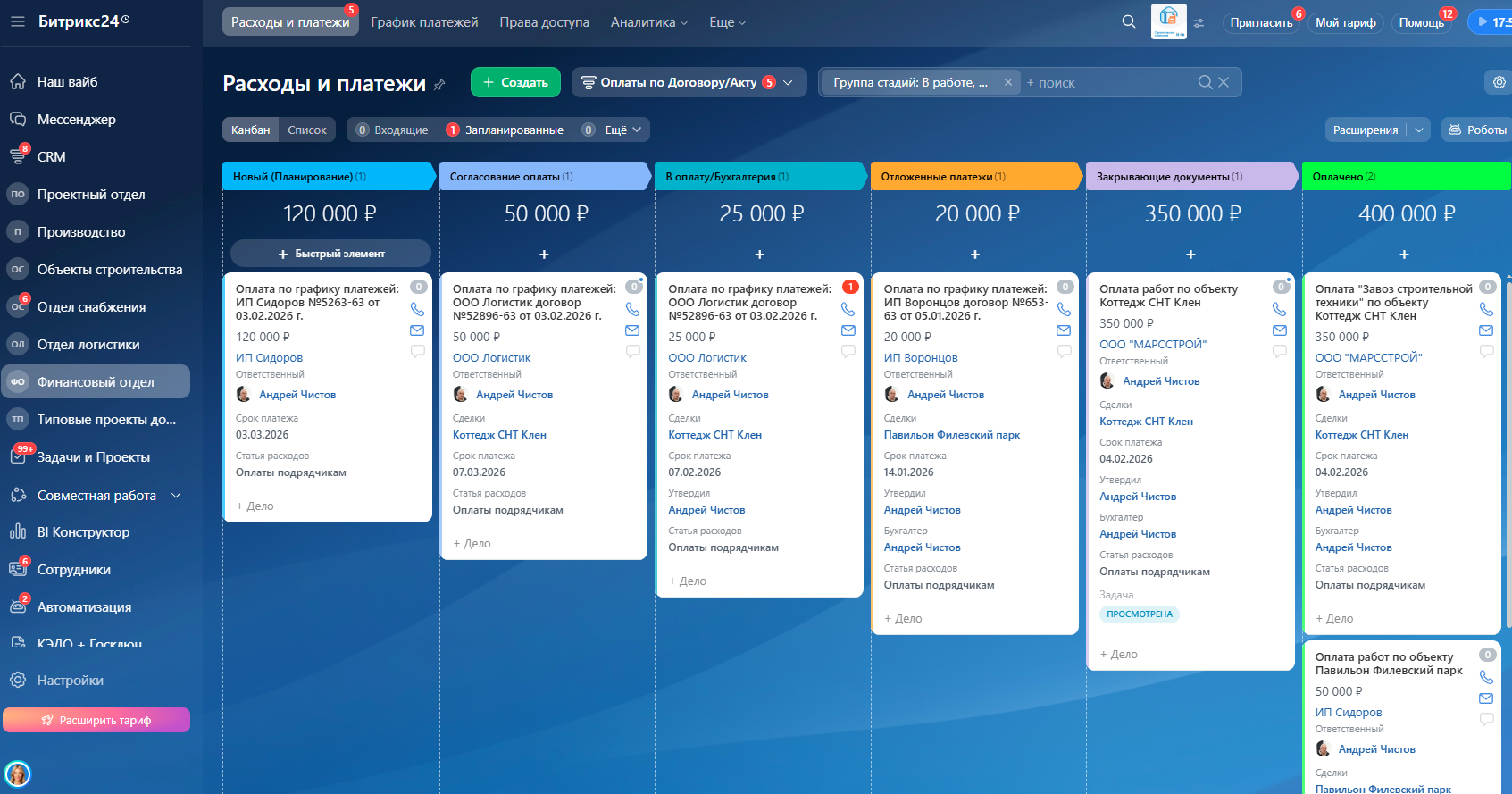 Для оптимизации работы Финансового отдела в систему интегрирован График платежей, где фиксируются запланированные оплаты по договорам с внешними подрядчиками и другие регулярные платежи, включая те, что создаются вручную. Когда наступает дата платежа, CRM автоматически формирует запрос на оплату в соответствующем направлении Расходов и платежей, заполняя все необходимые данные по платежу.