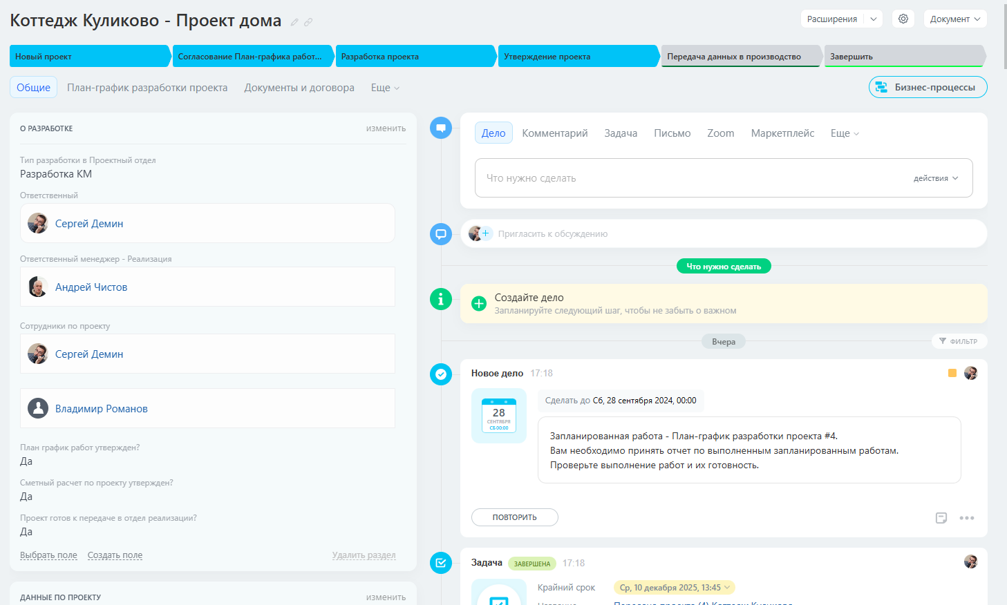 На стадиях работ по разработке дизайн-проектов настроена автоматизация постановки задач сотрудникам по проекту и контроль выполнения работ руководителем.