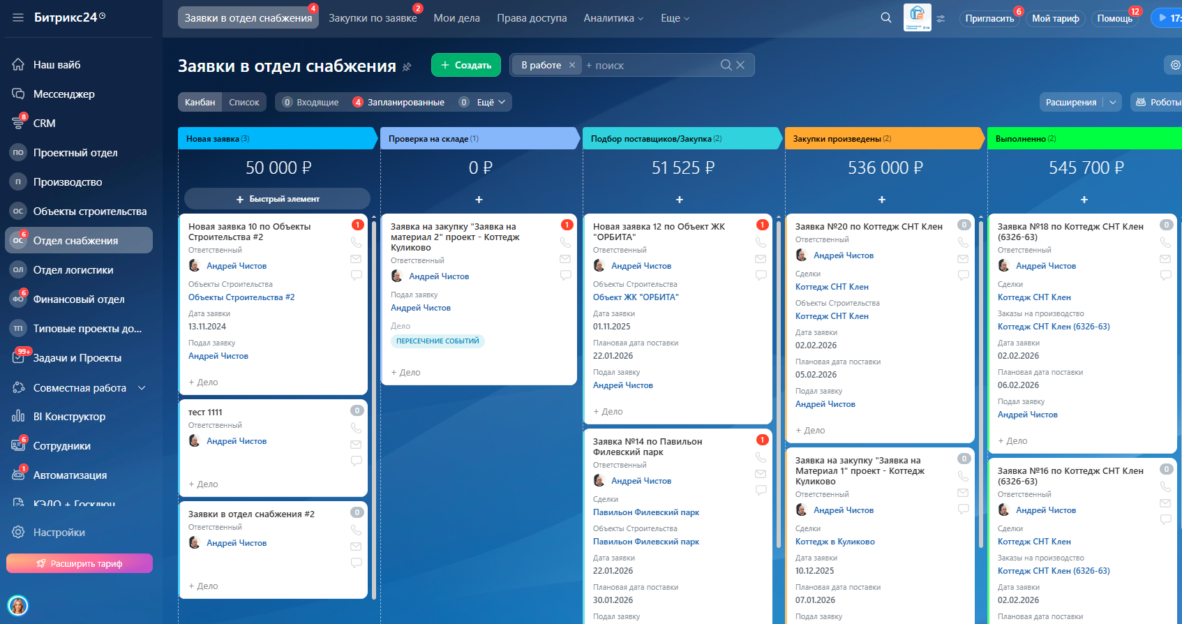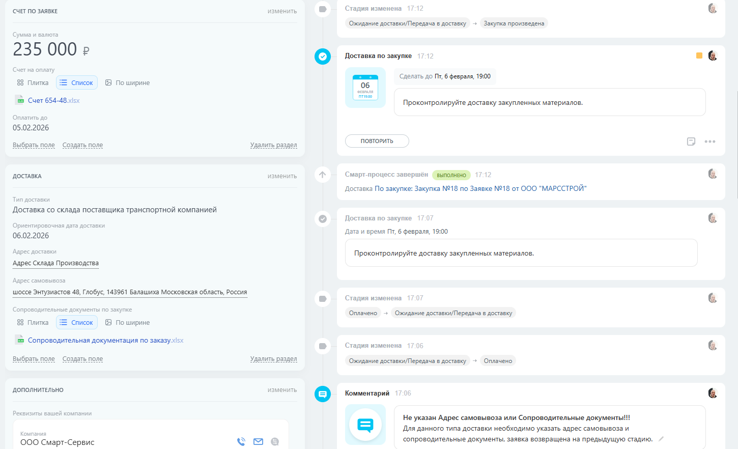 Для обработки заявок отделом снабжения предусмотрены специальные этапы. В карточке заявки созданы все необходимые поля для ввода данных.