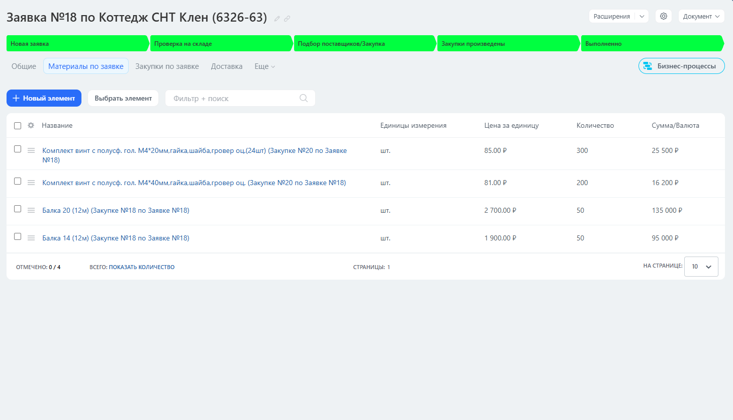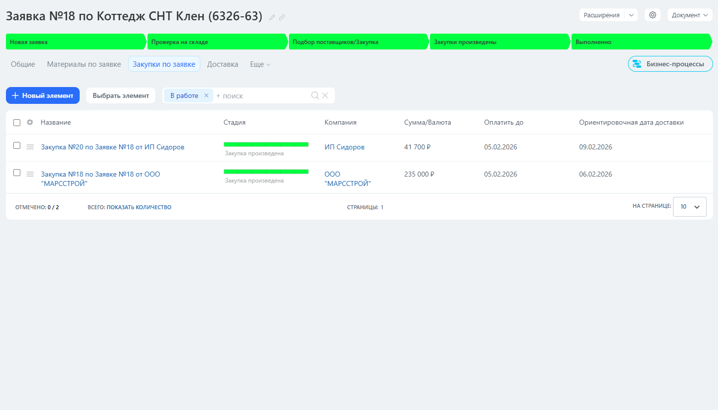 В процессе работы с карточками заявок и закупок были внедрены дополнительные интеграции, связывающие их с объектами смежных подразделений. Это включает заявки на доставку, оплаты по закупкам, а также списки материалов, относящихся как к закупке, так и к заявке.
