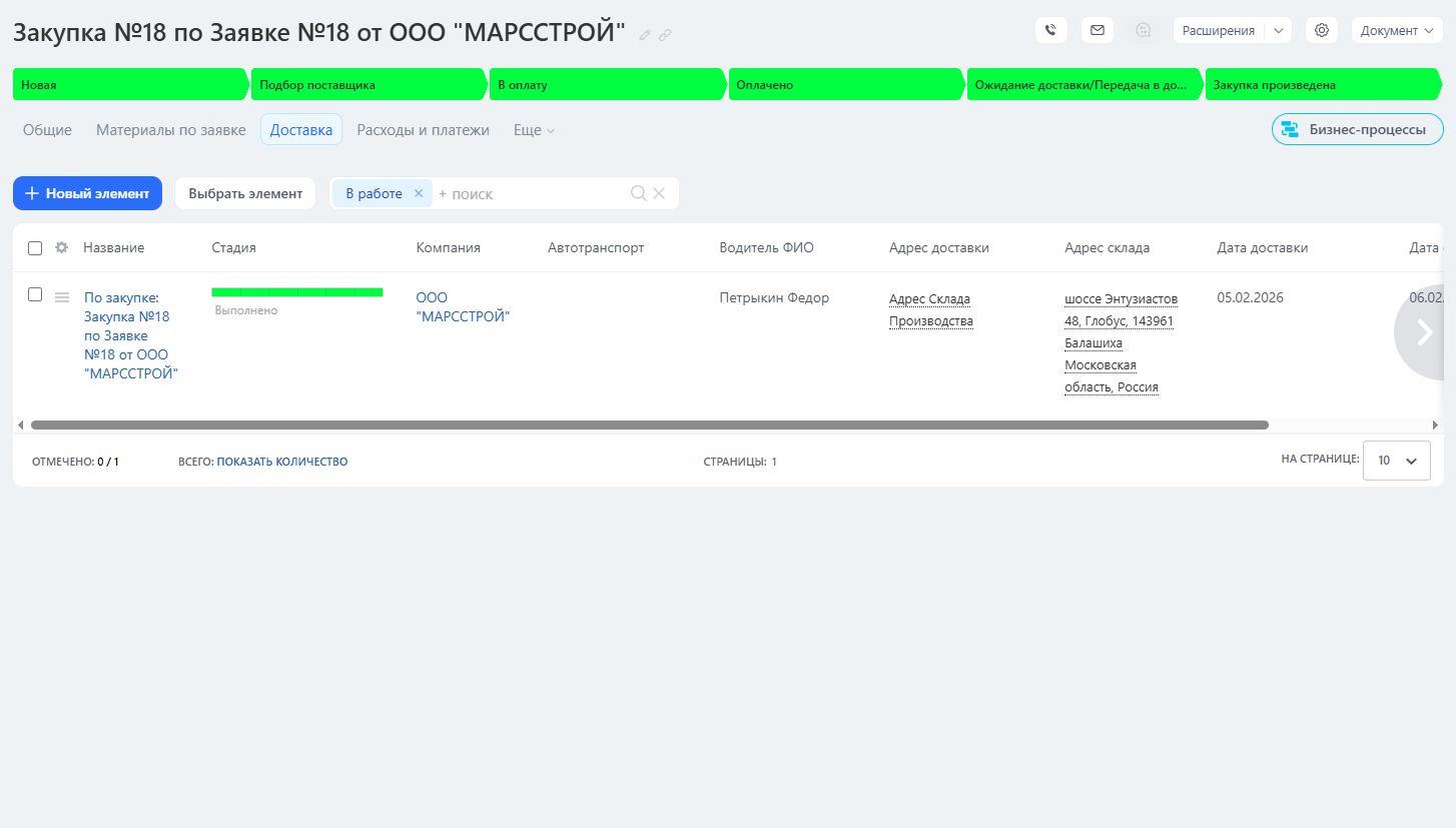 Если требуется организовать доставку, можно выбрать вариант самовывоза материалов со склада поставщика. В этом случае система автоматически создает заявку на доставку и передает в нее все необходимые данные по закупке.